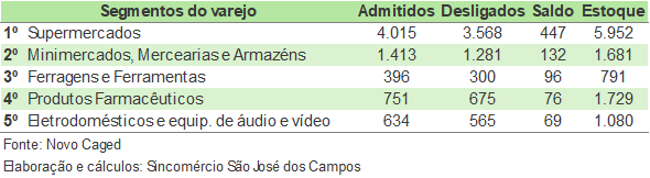 De volta ao desempenho do ano de 2025, observa-se que dentre os mais de 70 ramos que formam o varejo joseense, os supermercados foram aqueles que mais se destacaram positivamente ao longo do ano, após terem registrado a geração de 447 novos postos de trabalho, 71% de todo o saldo do varejo local ano passado.