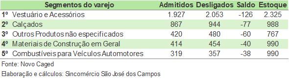 Por outro lado, o segmento de vestuário e calçados amargou a maior perda absoluta de vagas, com 126 desligamentos a mais que admissões em 2025.
