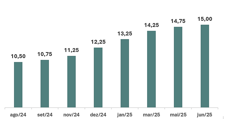Contrariando algumas expectativas, o Banco Central do Brasil em decisão unânime do seu Comitê de Política Monetária (Copom) decidiu neste último dia 18 de junho mais uma vez elevar a taxa básica de juros da economia, agora em 0,25 pontos percentuais, fazendo com que a Selic atinja os 15% ao ano, o seu maior nível em quase vinte anos. Como pode ser mais bem visualizado abaixo, a recente trajetória de altas sucessivas do juro básico brasileiro iniciou-se em setembro do ano passado. Boa parte do mercado até apostava em uma manutenção do patamar de 14,75% a.a. da reunião anterior, porém o Copom novamente decidiu pela continuidade do processo de elevação da Selic.